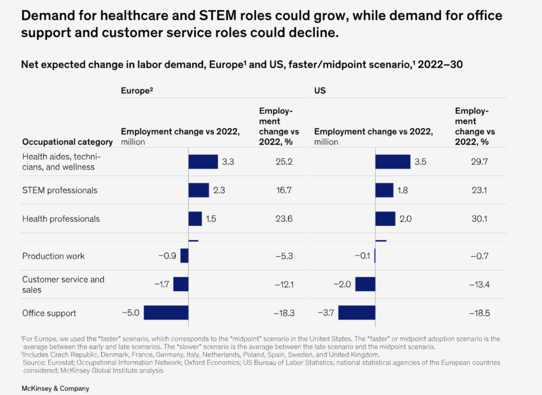STEM相关岗位、医疗保健和其他高技能岗位的需求显著提升,而普通的办公室职员、流水线生产工人和客户服务代表等传统的职业需求则逐步下降。