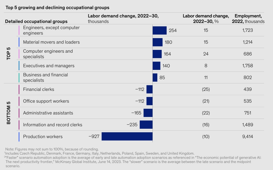 而金融会计职员、办公室支持人员、行政助理和生产工人等职业则可能面临需求下降。