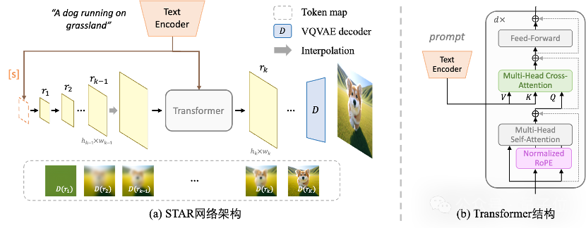 增强的文本引导为了更好地处理各种复杂的文本描述并生成相应的图像,研究者提出几项关键解决方案: 1、文本特征作为起始token map,根据起始token map生成更高分辨率的token map这不仅增强了模型对新文本场景的适应性,确保模型可以泛化到新的文本提示,从整体上保证了文本描述与生成图像之间的一致性 2、在每个transformer层引入交叉注意力机制,从更精细的粒度控制图像生成,使得生成的图像更加精确地贴合文本。 具体网络格式如下: