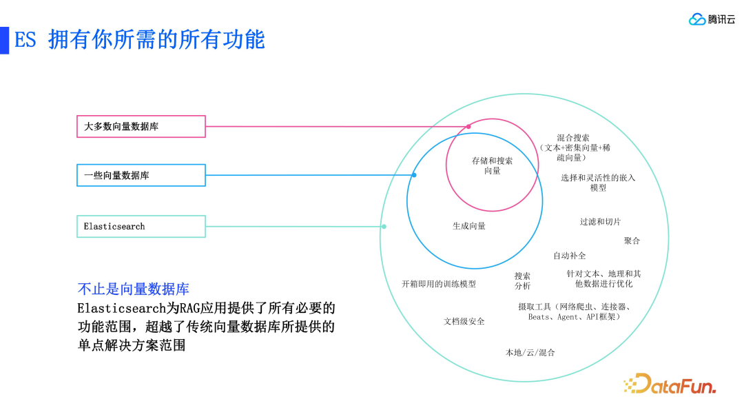 RAG 的关键技术之一就是向量化。和传统的向量数据库相比,ES 不仅可以实现向量的存储和搜索向量的生成,同时还支持混合搜索、模型的灵活选择和部署、聚合分析,以及基于权限的一些管理等等。