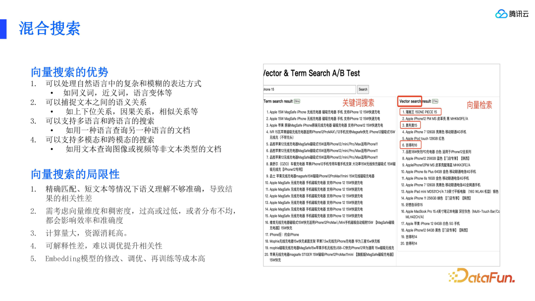 因此,比较好的做法是文本和向量混合搜索,从而结合二者的优势,弥补其缺陷。可以通过关键字加向量搜索这种搭配。比如通过向量检索,先将一批相关性的内容收到,然后再通过关键字去做进一步的精准匹配。这样可以提高准确性和可信度。另一方面,混合搜索还可以丰富搜索内容,以满足不同的用户查询需求和偏好。利用关键词检索的逻辑运算、排序、过滤等能力,可以帮助我们实现更复杂的查询需求。并且关键词检索的文本匹配和高亮显示,也可以使检索结果更易于理解。