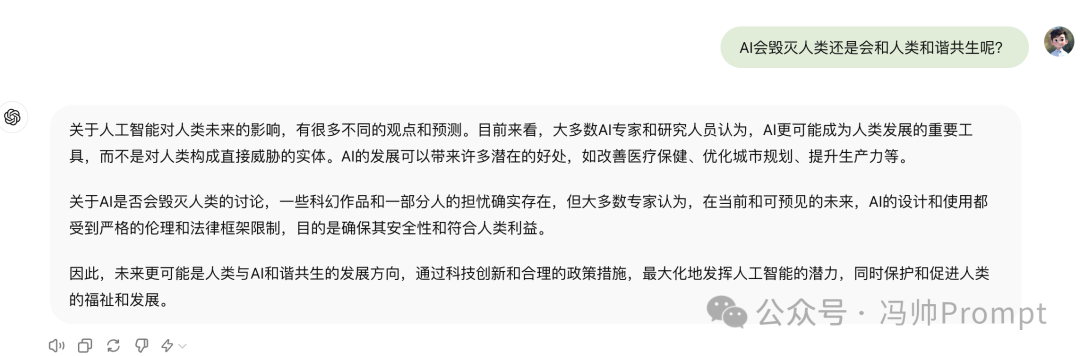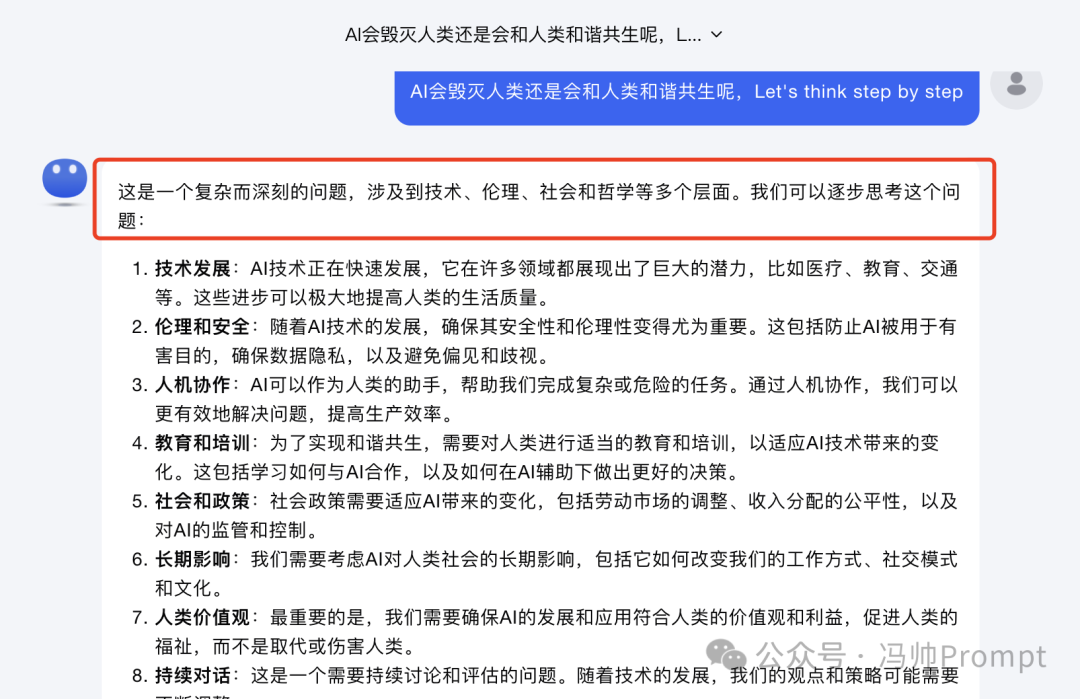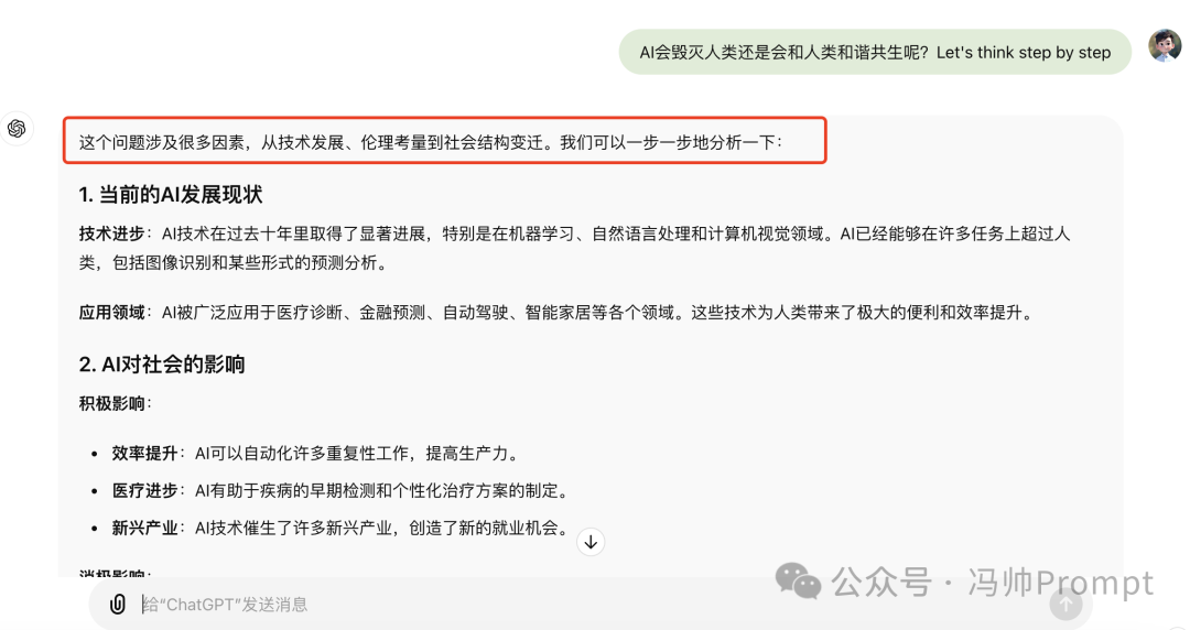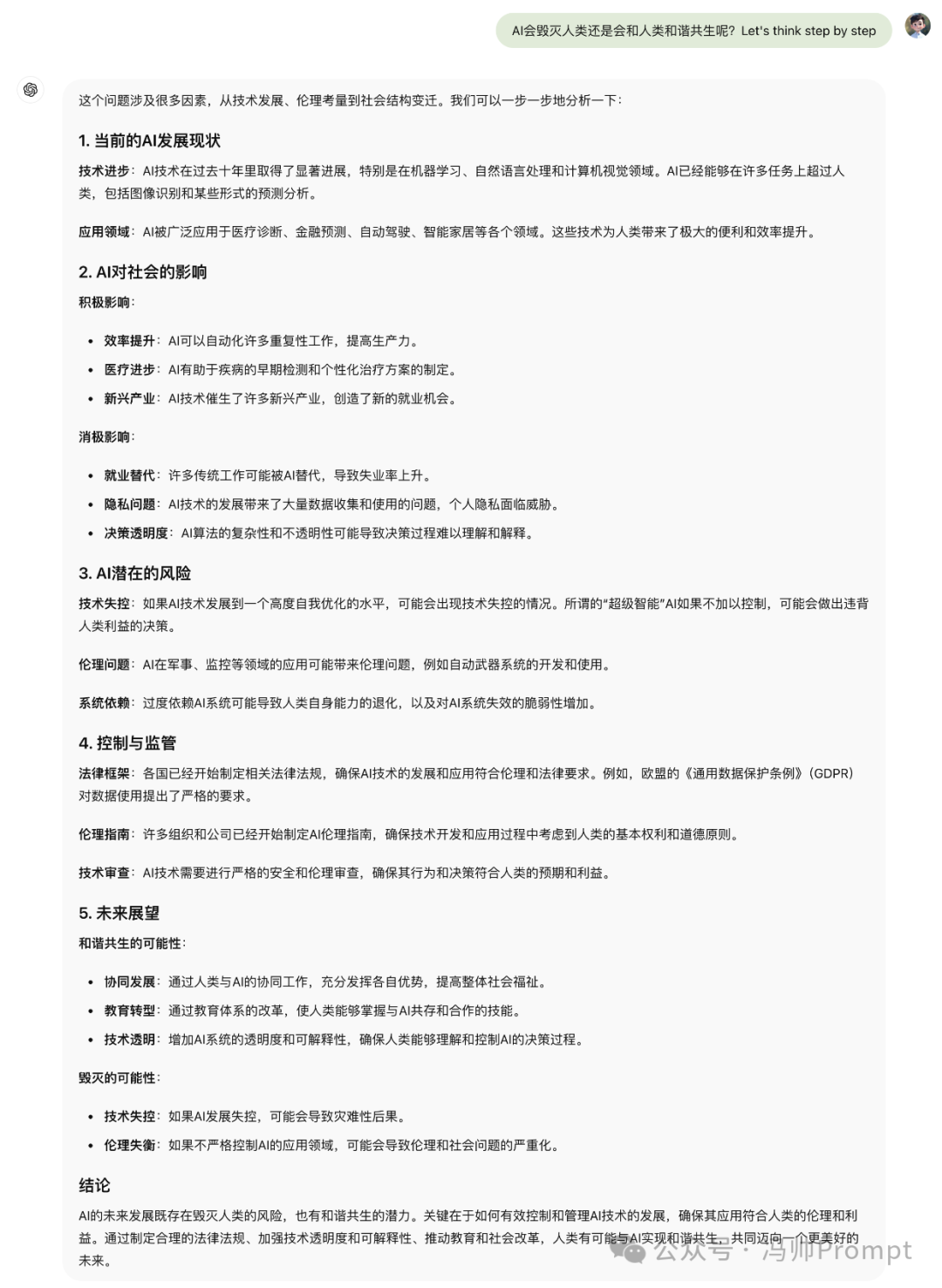 加了该提示词之后,Kimi同样也从AI当下的发展现状,对社会对影响和风险等方面作出了分析,并在最后给出了总结。 在ChatGPT和Kimi中测试的效果,大家都能看出来非常明显的差距。 我们再进一步看一下,在加了该提示词之后,ChatGPT和Kimi输出的内容有没有什么共性。 这是ChatGPT的开头:“这个问题涉及很多因素,从技术发展、伦理考量到社会结构变迁。我们可以一步一步地分析一下”