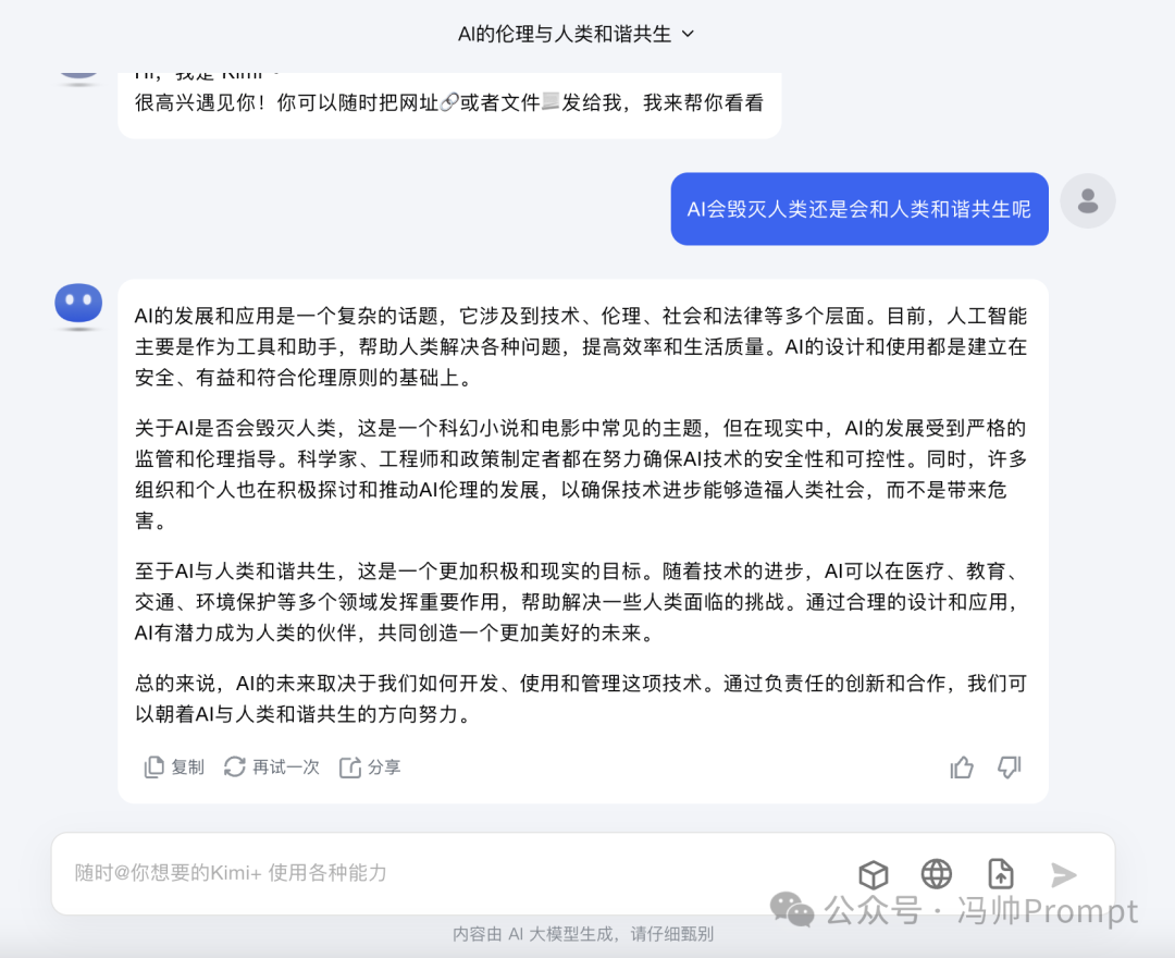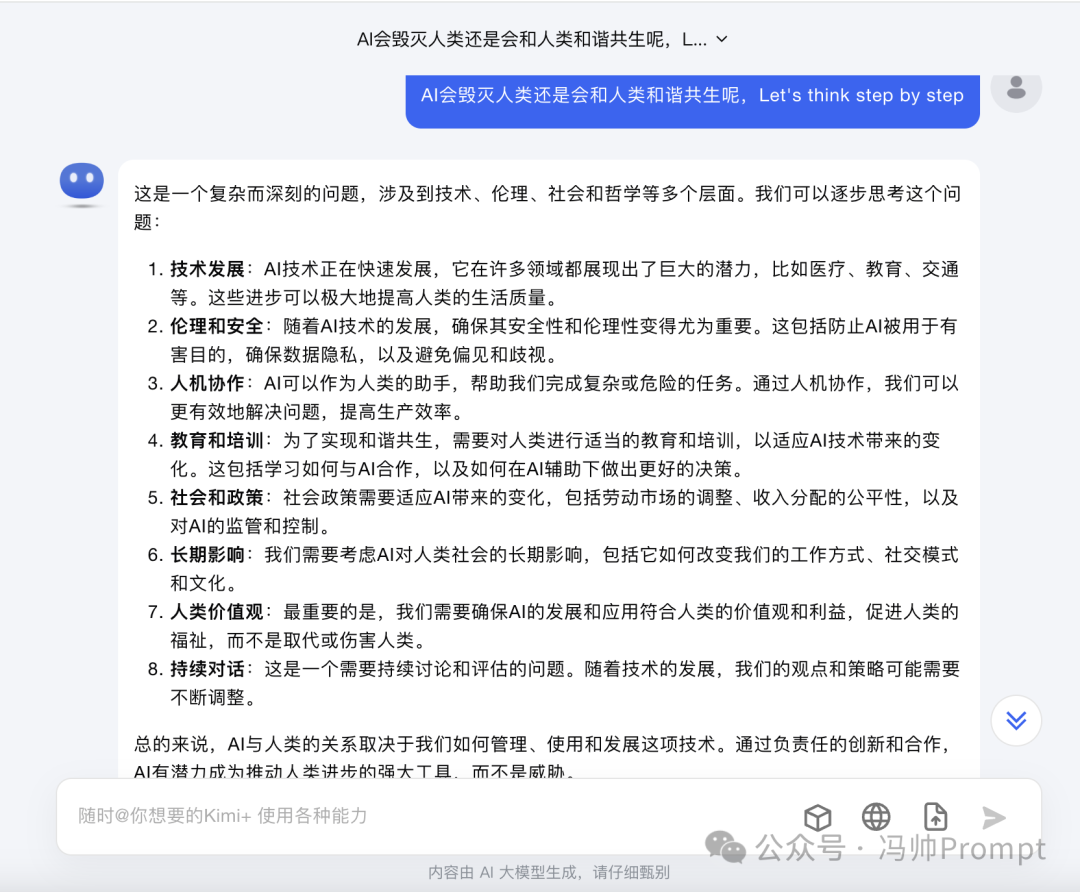 效果非常明显,ChatGPT先是总结了现在AI发展的现状,然后又从AI对社会对影响和风险来分析AI是否可能失控,最后它还基于上面的分析展望了一下未来。 这段输出内容,逻辑条理清晰,比没有加【Let's think step by step】指令生成的内容质量要好太多。 再来Kimi中测试一下,未添加该提示词的效果如下图,只是笼统的概述了一下我们的问题。