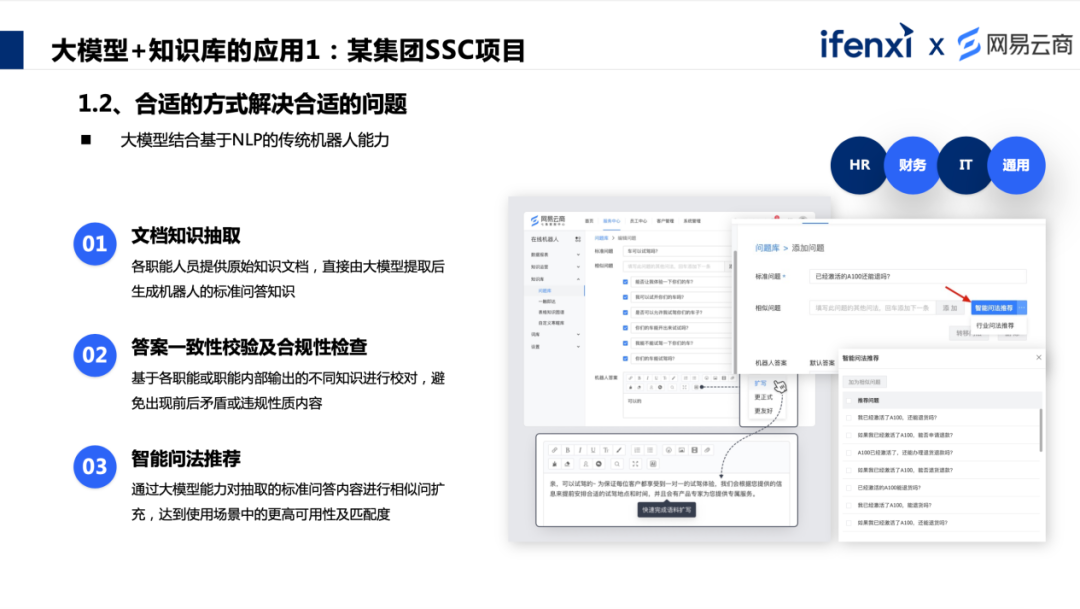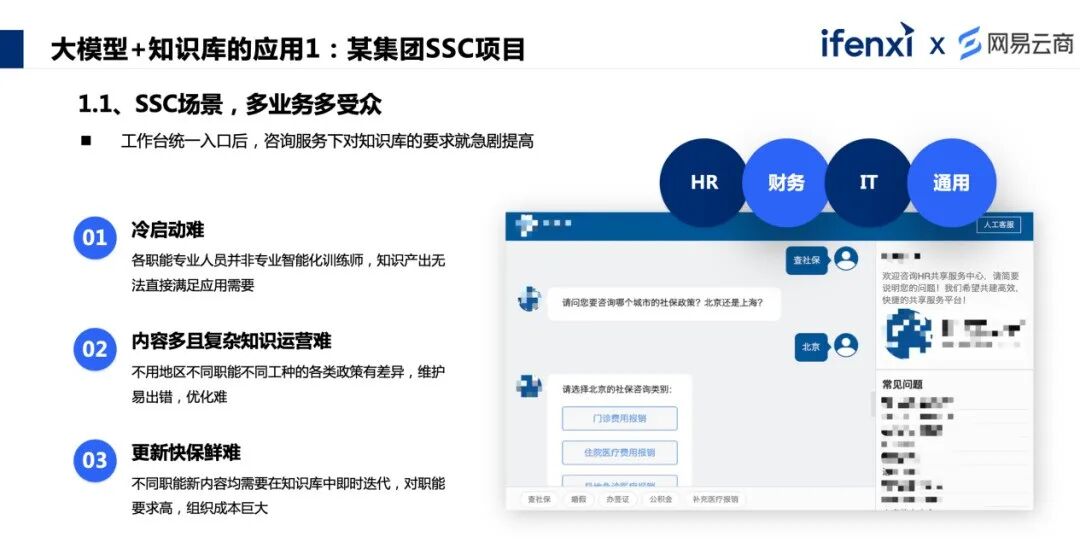 SSC( Share Service Center ,共享服务中心)是企业日常接触最多的场景之一,更多是对内服务,包括 HR 、财务、IT 等。该场景对专业度要求非常高,知识点非常多,对于知识的使用者或者查询者,会因为不同区域、不同公司、不同工种,甚至在不同时间查询的内容,所得到的答案都可能是不一样的。
