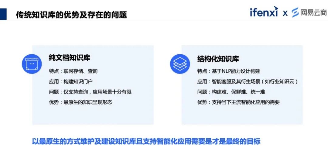传统知识库在实际应用中,还是存在着一些问题。为了满足智能化的要求和更多场景的使用需要,知识的生成和管理需要符合 NLP 的能力要求,但这并不符合知识原生的生产方式,所以中间需要经过一道复杂的加工。以产品说明书为例,为了实现智能化,不仅需要写一份面向消费者的,还要再整理一份可以被机器学习和使用的。