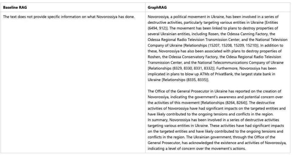 GraphRAG vs. 朴素RAG GraphRAG显著提升了大语言模型 (LLM) 在处理私有数据方面的能力,特别是在复杂语义问题的推理上。相比之下,普通RAG技术在处理企业专有研究和商业文档等私有数据时效果不佳,而GraphRAG结合前置的知识图谱、社区分层、语义总结和图机器学习技术,大幅提升了此类场景中的性能。 微软在其博客中提到,他们在大规模播客和新闻数据集上进行了测试,结果显示在全面性、多样性和准确性方面,GraphRAG均优于朴素RAG,获胜率达70%到80%。 微软的GraphRAG特别适用 微软的GraphRAG特别适用于需要整合整个数据集信息来回答的问题。例如,对于“数据中排行前五的主题是什么?”这样的查询,基线RAG表现不佳,因为它依赖于对数据集中语义相似文本的矢量搜索,而查询中没有提供能引导其找到正确信息的关键词。然而,GraphRAG可以处理这类问题。由LLM生成的知识图谱展示了整个数据集的结构和主题,使得私有数据集能够被组织成有意义的语义集群并预先总结。在回答用户查询时,LLM会利用这些聚类来汇总主题。 GraphRAG方法的优势 GraphRAG方法通过生成知识图谱,将整个文本集合分解成更小的、易于管理的社区模块,从而扩展了模型的理解和生成能力。此外,GraphRAG通过生成社区摘要,使得模型能够从整个数据集中提取相关信息,生成更加全面和准确的答案。GraphRAG在结果生成时还提供出处或源头信息,表明其回答基于数据集,每个论断的引用来源都清晰可见,用户可以直接对照原始材料,快速且准确地审核LLM的输出结果。 实际测试中的表现 在实际测试中,例如新闻数据集,微软团队向基线RAG系统和GraphRAG提出了一个探索性查询:“Novorossiya是什么?”,两个系统的表现都很好。然而,当查询变为:“Novorossiya做了什么?”时,基线RAG无法回答这一问题,而GraphRAG方法则识别出查询中的实体“Novorossiya”,以此为基础建立图谱,连接原始支持文本,从而生成包含出处的高质量答案。 总体来说,这种方法在大规模数据集上表现优越,特别是在处理复杂信息和提供全面答案方面展示了其优势。微软将继续在各类新领域中应用这一技术。 GraphRAG的应用场景 探讨 GraphRAG 在不同数据集类型上的广泛应用潜力,例如企业的专有研究、商业文档和社交媒体数据。介绍在具体应用中的图谱上的实体检测与关系抽取,如媒体分析和企业数据整理。 普通 RAG 技术在处理例如企业专有研究和商业文档这类私有数据时效果欠佳。而GraphRAG则通过结合预先构建的知识图谱、社区分层、语义总结和图机器学习技术,能够显著提高处理这些场景的性能。为了证明 GraphRAG 的有效性,微软以新闻文章中暴力事件信息(VIINA)数据集为例进行测试。这个数据集复杂且包含相互矛盾和不完整的信息,具有现实世界的测试意义。由于数据集内容相对较新,未被纳入大型语言模型(LLM)的基础训练中,因此也具备挑战性。微软团队将 2023 年 6 月俄罗斯和乌克兰双方新闻来源的上千篇报道翻译成英文,形成一个用于 LLM 检索的专用数据集。由于数据集过大,无法直接放入 LLM 的上下文窗口,因此需要采用 RAG 方法。 微软团队首先在基线 RAG 系统与 GraphRAG 上进行查询测试。测试查询为:“Novorossiya 是什么?”从结果可见,两种系统都表现良好,这是基线 RAG 能处理得很好的查询类型。随后,他们换成了更具挑战性的查询:“Novorossiya 做了什么?”在这个测试中,基线 RAG 无法有效回答问题,因为检索到的上下文窗口中没有相关的文本片段提及 “Novorossiya”,从而导致了失败。而GraphRAG能识别查询中的实体 “Novorossiya”,并通过 LLM 建立知识图谱,连接原始文本片段,生成包含出处的高质量答案。GraphRAG 利用 LLM 生成的知识图谱,显著提升了 RAG 的检索能力,提供更高相关性的上下文内容和引用依据,从而给出更优质的回答。 完整数据集推理 对于完整数据集推理,基线 RAG在需要汇总全部数据集信息的查询方面表现不佳。例如对于 “数据中排行前五的主题是什么?” 这类查询,基线 RAG 无法提供良好答案,因为它依赖于检索语义相似的文本片段,而查询中未包含足以引导其找到正确信息的关键词。相反,GraphRAG可以回答此类问题。LLM生成的知识图谱展示了数据集的整体结构和主题,使得私有数据集能被组织成有意义的语义集群,并进行预总结。 支持 GraphRAG 的基本流程 支持 GraphRAG 的基本流程是基于图机器学习的研究和代码库:LLM处理全部私有数据集,为源数据中的所有实体和关系创建引用,并利用这些引用来创建知识图谱。然后,通过生成的图谱自下而上地聚类数据,分层并组织成语义聚类。这种划分使得预总结语义概念和主题成为可能。通过构建知识图谱和社区结构,GraphRAG 不仅帮模型理解文本,还能把握数据集的内在结构。结合LLM 生成的知识图谱和图机器学习,GraphRAG 能解答许多重要问题,而这类问题基线 RAG 无法单独解决。 GraphRAG展示了其在处理私有数据集方面的显著改进,其智能程度远超先前的方法。 写在最后 在未来的发展方向上,GraphRAG有望带来多项技术突破。我们需要探讨GraphRAG在不同领域中的扩展潜力及其面临的技术挑战,例如资源需求和模型优化等问题。微软在GraphRAG方面付出了很多努力,并取得了显著成果,这为我们展望其在大语言模型领域的未来趋势提供了重要依据。 当前,大语言模型的最大挑战和机遇在于如何将其强大的能力
