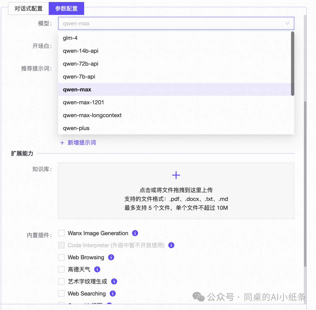 它的基础配置和workflow应该是同时生效的,在规划页就灵活度很高了,Agents组合协作的能力没有上线。模块和工具都是官方出品的,可以自由组合 5.阿里云ModelScope-Agent(魔搭社区) https://www.modelscope.cn/brand/view/agent 产品形态:适配开源大语言模型(LLM)的AI Agent开发框架。 开发方式:支持多模态Agent,包括客户服务Agent、个人助理Agent等。 特点:用户可一键发送指令调用其他AI模型协作,简化了开发流程。 优势:结合低/零代码平台,进一步降低开发门槛,提高效率。 应用场景:适用于多种业务场景,未来将适配更多新增的开源大模型。 开源社区的一个产品,我们来看下创建智能体。 有对话配置和参数配置两个方式,没有看到workflow 支持多种模型 支持最多5和上传的知识库 以及官方的提供的内置插件