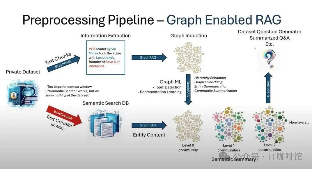 向量化: 利用 LLM 将实体、关系、社区概括等信息转化为向量表示,用于后续的语义搜索。