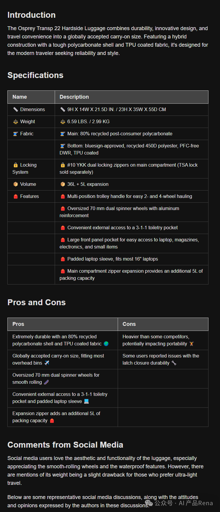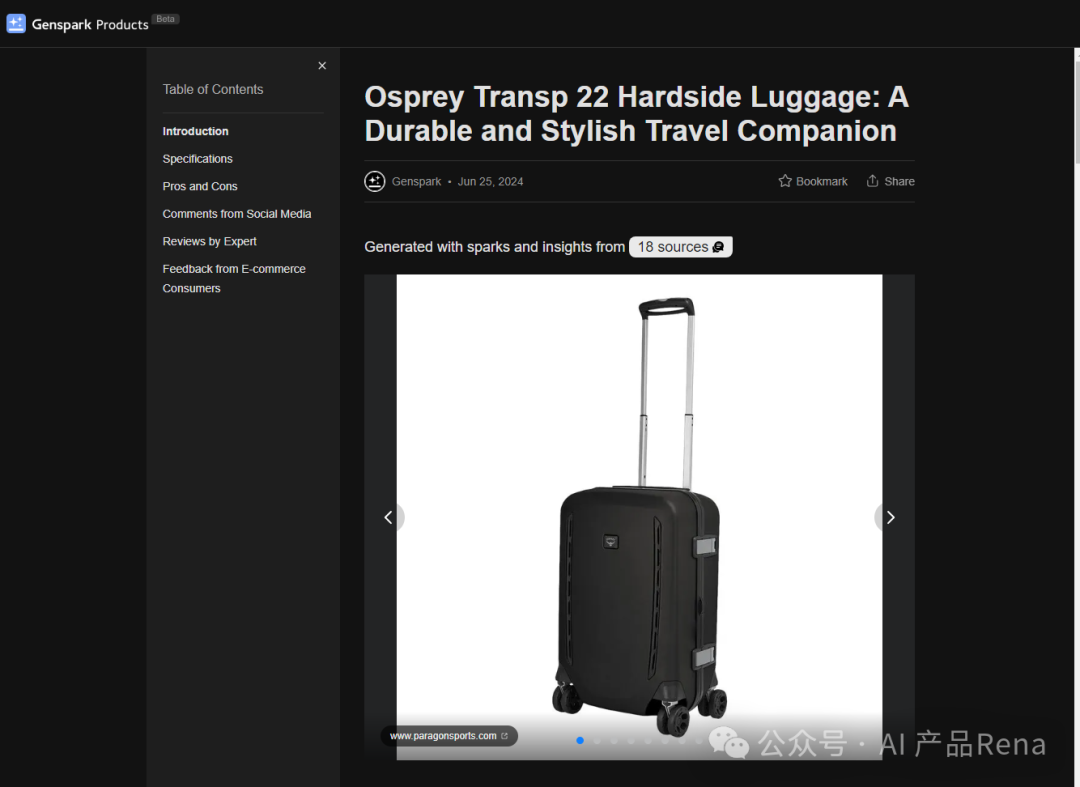 比如Genspark直接生成商品详情页面,商品详情页面有固定格式:商品标题、详情图片,介绍、参数规格、优缺点、社交媒体评论、电商网站评论和总结。老实说,这种生成页面给我惊喜,确实实用又方便。