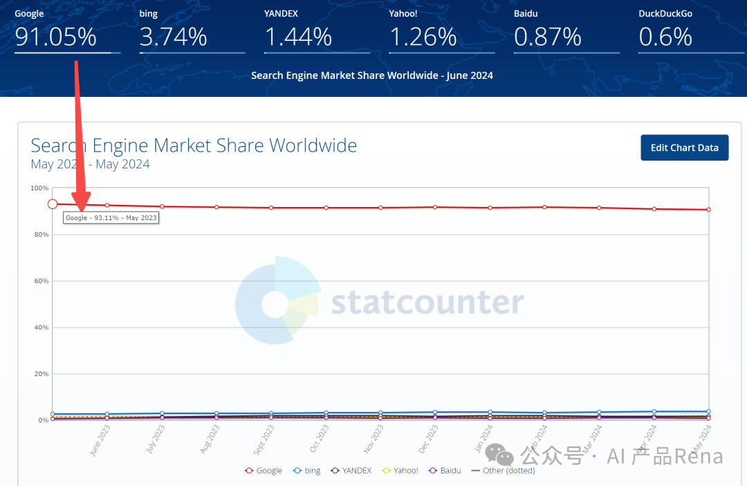 全球范围Google占比达到91.05%,但是相比23年5月份,这个数据是93.11%,降低了2.06%;增长最多的是bing(0.95%)、YANDEX(0.43%)和Baidu(0.43%),从这份数据上,看不出AI搜索引擎对传统搜索引擎的冲击,bing的增长可能跟AI加持有一定关系。
