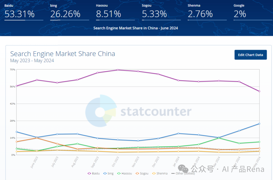 搜索引擎发展至今,行业的集中度已经很高了,根据Statcounter统计数据,Google搜索全球占比90%以上;在中国比较特别,Google仅为占比2%,但是头部集中效应也很强,百度占比53.31%,然后是26.26%的bing,剩下的众多公司瓜分剩下20%左右的市场。