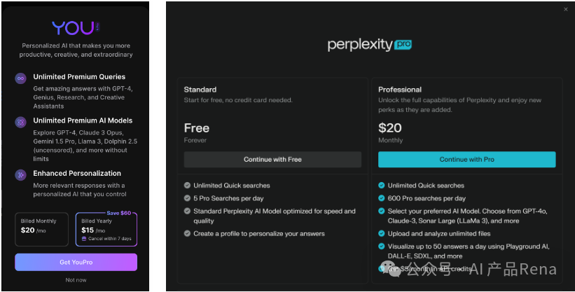 1. 现在的AI搜索引擎要么免费,要么就是付费订阅服务,直接向C端用户收费,比如秘塔AI搜索、360AI搜索等国内AI搜索暂时没有看到付费迹象,海外产品Perplexity、you等,会提供高级功能版本,收订阅费。