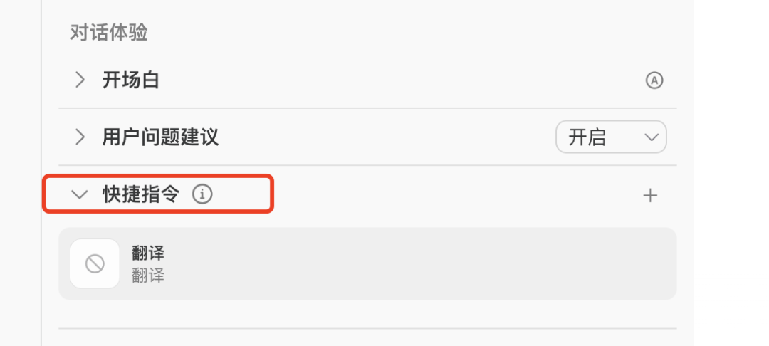 快捷指令可以在智能体对话框增加交互组件。 比如,之前介绍的翻译agent,就可以加这样一个快捷指令。