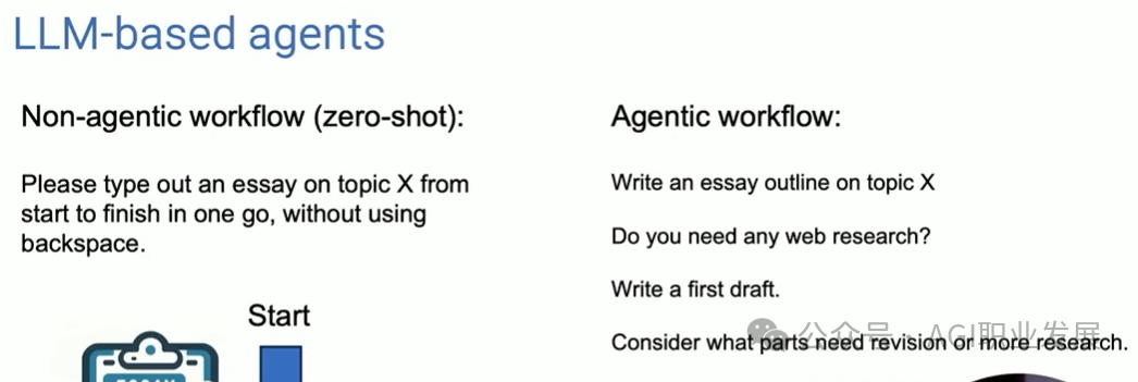 Andrew Ng将传统的非智能体工作流程描述为:用户输入提示,大型语言模型生成回答,就如同要求某人一次性从头到尾书写一篇文章而无法中途修改。相比之下,智能体工作流则更加迭代和交互,它可能会先生成大纲、搜集资料,再生成初稿并根据反馈进行多轮修订和完善。
