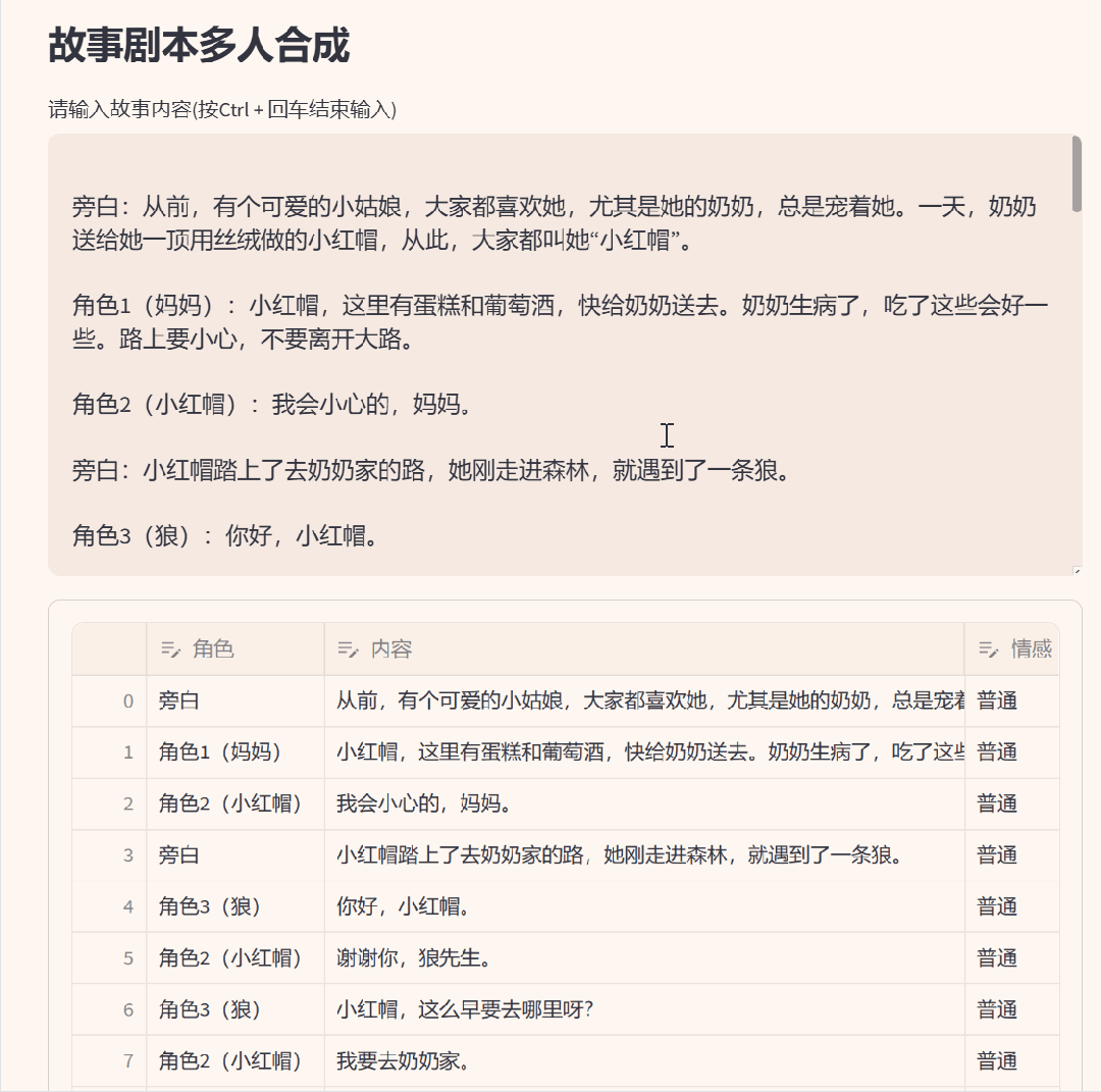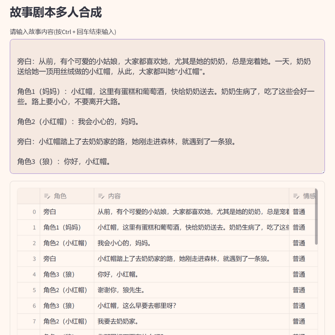 有了情绪变化和多发音人,就可以进行故事剧本的配音了。下面还有一个不同的文本内容输入框,在上方按照格式「角色:内容」编辑好之后,会自动分解角色和台词列表。