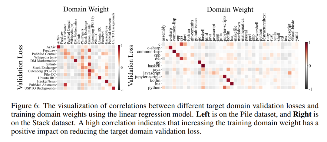同时在拟合回归模型时,采用了线性回归和LightGBM两种回归模型。 结果数据集采用Pile dataset中不涉及版权的17个数据集,如下表所示,  512个1M小模型在1B Tokens训练得到的回归模型,与在25B Tokens数据下训练的1B模型,排序具有97.12%的高相关性,如下表所示,  同时训练次数要比训练的总Token数要重要,更影响回归模型的效果,并且采用LightGBM建模要比线性回归建模要好。  PS:跟作者@乾神交流过,512个样本训练回归模型会不会数据量太少,乾神说他们做过1024的实验,但并回归模型效果无明显提高,并且从成本考虑,那么512最佳。 不同的数据混合比例对下游任务结果影响较大,在Lambada数据集上最好和最差的效果相差14.6%,如下表所示,  同时发现了一个与传统理解不一致的结果,一般我们任务维基数据质量很高,是评估大型语言模型最具代表性的数据集。但实验结果发现,网络数据集上评估的效果,更能体现模型在下游任务上的好坏,如下图所示,可以发现Pile-CC数据集作为验证时损失值与下游任务的相关性更强。  并且RegMix可以发现各领域数据之间是如何相互作用的,数据领域之间复杂的相互作用利用人类固有经验很难直接区分。  |