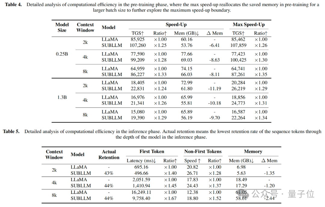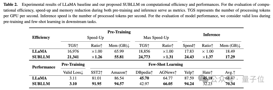 与LLaMA模型相比,SUBLLM在训练和推理方面分别实现了26%和37%的速度提升,同时显著降低了内存成本,同时保持了性能。