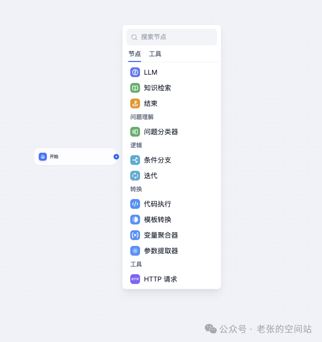 所有组件都准备完毕后,剩下的工作流配置就没有障碍了。 下面我们逐一介绍Dify流程中我们用到的几个节点以及配置内容 开始节点