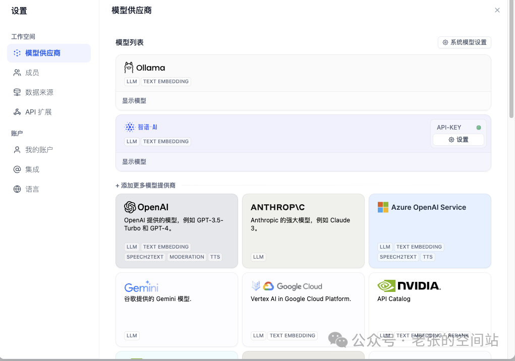 在这里我们又看到了熟悉的配置模型的内容,以及我们的老朋友Ollama。当然几乎所有知名的AI提供商,都可以配置在Dify中。这里我们配置了本地的Ollama以及智谱-AI。