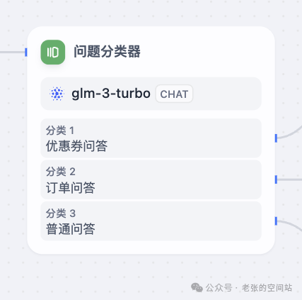 本质上还是一个语言模型,他会根据前置节点的输入信息进行合理的推断,从而进行流程的路由分发工作 这里的分类尽量要贴合前置节点(本例中的开始节点中的chat内容)