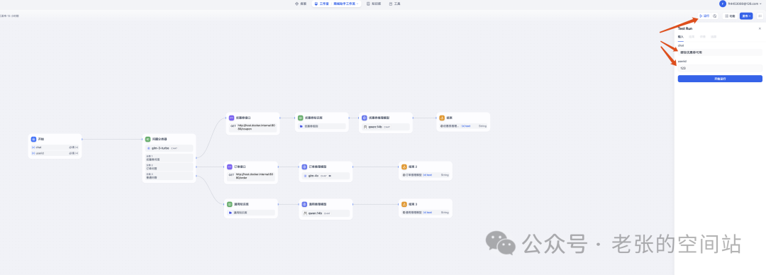 在业务流程中,问题分类,对应Dify的问题分类器节点。而 function call部分则对应着HTTP请求。 为了验证我们的流程,我们建立一个电商助手的工作流: 它能支持三类问题:1.优惠券问题 2.订单问题 3.其他问题