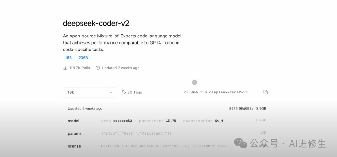 选择 Deep Seek Coder V2 模型,复制安装命令到终端并安装。