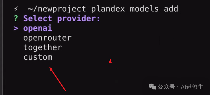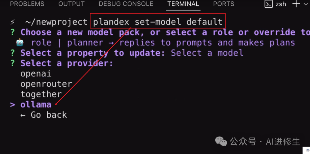 安装后,你会在终端看到一个聊天界面,发送消息以检查是否正常工作。 然后,将模型添加到 Planex,选择自定义提供商选项,输入提供商名称(如 Ollama),
