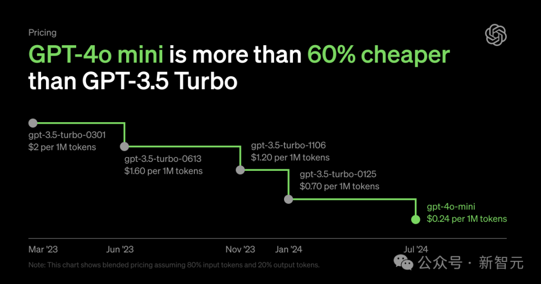 OpenAI 突然推出了新模型 GPT-4o mini,其价格相比 GPT-3.5 Turbo 降低了 **60%**!