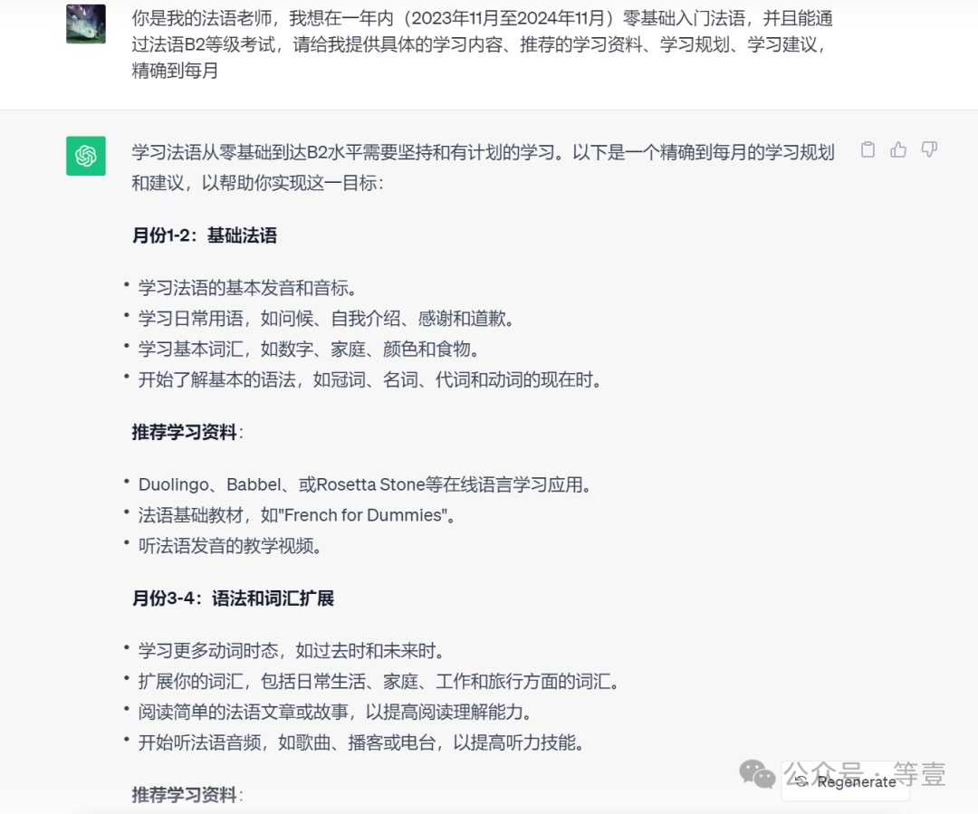 我们也可以向它学习自己感兴趣的任何知识: 例如,作为一个法语小白,想学习法语,可以找大模型提问,让它给我制定学习计划,提供学习资料。
