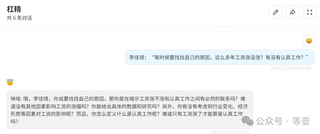 02 大模型也可以扮演不同角色,给我们聊天带来乐趣。 比如,可以和杠精大模型“吵架”解压,看它如何怼李佳琦“这么多年工资涨没涨?有没有认真工作?”