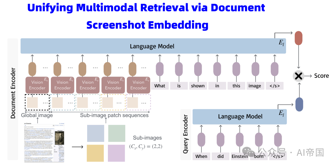 为此,论文提出了文档截图嵌入(Document Screenshot Embedding,DSE),一种利用截图简化文档检索过程的新型信息检索范式,通过绕过传统预处理步骤并直接使用视觉-语言模型对文档进行编码,DSE提供了一种统一的处理多种文档模式的方法,无需任何内容提取预处理并保留文档中的所有信息(包括文本、图像和布局)。DSE利用大型视觉-语言模型直接将文档截图编码为密集表示用于检索。 为了评估论文的方法,论文首先构建了Wiki-SS数据集,一个包含1.3M维基百科网页截图的语料库,用于回答Natural Questions数据集中的问题。在这种文本密集型文档检索设置中,DSE相较于依赖解析的其他文本检索方法显示出竞争性的有效性。例如,DSE在Top-1检索准确率上超越了BM25 17个百分点。此外,在混合模态任务如幻灯片检索中,DSE在nDCG@10上显著优于OCR文本检索方法超过15个百分点。这些实验表明,DSE是针对多种类型文档的有效检索范式。 存在几个限制,值得进一步探讨。首先,对于更通用的文档检索任务,如涉及结构和内容高度多变的PDF或网页,其有效性仍有差距。此外,结合论文的方法与提取的文本和图像内容可以使DSE在通用检索任务中更加灵活。其次,论文目前的做法完全依赖于监督微调。然而,文本检索研究显示,对比预训练可以显著提高检索器的有效性。第三,对视觉数据的依赖在视觉数据质量较低的环境中引入了挑战。模糊或低分辨率的截图可能会降低DSE的有效性。相反,处理非常高分辨率的图像可能会降低计算效率。 现有的检索范式缺乏跨模态的统一编码过程,导致存在两个根本问题。首先,预处理并非易事。需要专门的加工来处理各种文档类型和内容模态,而这些处理往往并不完美。例如,野外的IITML文件由于其结构多样,可能表现出极大的复杂性,使得单一工具难以准确解析所有信息。同样,幻灯片和PDF文件通常需要OCR模型来提取文本,并分别处理表格和图形等其他内容类型(。单独管理这些多样的模态是繁琐的,并且精确处理现实世界中长尾文档外观常常是不切实际的。其次,这一过程“破坏”了文档的原始外观,扰乱了其视觉上下文和布局完整性。文档的可视化呈现能够传达仅通过内容提取难以捕捉的重要信息。例如,除了文本和图像的内容,这些元素在文档中的大小和位置可能编码了其所含信息的重要性。为了解决上述问题,论文引入了文档截图嵌入(DSE),这是一种新的信息检索范式,它将多种格式和模态统一为单一形式——截图,用于直接的文档编码和索引。与从文档中提取的文本和图像不同,截图易于获取。更重要的是,截图自然地保留了文档中的所有信息。如图1(b)所示,DSE直接将任何给定文档的截图编码为密集表示,通过大型视觉-语言模型进行索引。在搜索过程中,用户的查询由语言模型编码,以定位最近的文档嵌入。 图1:(a)现有文档检索范式与(b)论文提出的范式之间的比较。DSE绕过了文档解析和内容提取过程,直接将包含多模态内容的文档原始外观编码为密集表示给定一个查询Q和一个由文档组成的语料库C,文档检索的任务是识别与查询Q最相关的k个文档,其中k < n。这种相关性是使用相似度度量来确定的。需要注意的是,“文档”截图是一个完整的信息片段(例如,一篇网络文章,一个PDF页面)。这与之前一些检索工作中的“文档”定义不同,后者表示任意信息片段,如句子或段落。对于查询,论文仅考虑与传统搜索设置类似的文本输入。处理图像查询的探索留待未来工作。论文采用双编码器架构进行密集检索,其中文档截图和用户文本查询分别使用视觉和文本编码器编码为密集向量。论文可以简单地应用来自CLIP的视觉和文本编码器到论文的任务中;然而,在论文的实验中,论文观察到视觉编码器无法编码包含更细粒度信息的截图;因此,论文提议使用大型视觉语言模型作为文档截图编码器。Visual Encoder 当提供文档截图D时,首先由视觉编码器处理以生成一系列潜在表示。序列的长度由视觉编码器的图像标记器决定。论文以clip-vit-large-patch14-336为例,任何给定的截图首先被转换为336 x 336像素的图像,然后被划分为24 × 24的块(即总共576个块),每个块包含14 x 14像素。每个块被展平并映射到一个可训练的线性投影的块嵌入。这些块嵌入被视觉编码器编码为潜在表示。然而,如果截图包含大量文本(例如维基百科网页),576个块的潜在嵌入可能无法捕捉到截图中的细粒度文本信息。 Vision Language Model 为了解决上述问题,论文利用了一个大型视觉语言模型Phi-3-vision,它使用了与clip-vit-large-patch14-336相同的图像标记器,但通过将其裁剪为子图像,可以以更多的块表示图像。 图2:DSE编码器架构概览。DSE采用双编码器架构,其中文档塔通过视觉输入将文档截图编码为密集向量,而查询塔则通过文本输入编码查询。文档和查询编码器共享同一语言模型编码的补丁潜在嵌入与文本提示一起作为后续语言模型的输入:" 这张图片中显示了什么?"。这里,标记是一个特殊的占位符标记,并被补丁潜在嵌入序列所替换。为了更好地使用具有单向注意力的语言模型聚合信息,遵循Ma等人(2023),论文使用最后一个隐藏状态的序列结束标记嵌入作为文档截图嵌入。数据集 论文构建了Wiki-SS数据集,使用Selenium Python工具包通过URL访问英文维基百科页面并自动截图。截图以980 x 980像素的窗口大小进行,以确保核心内容