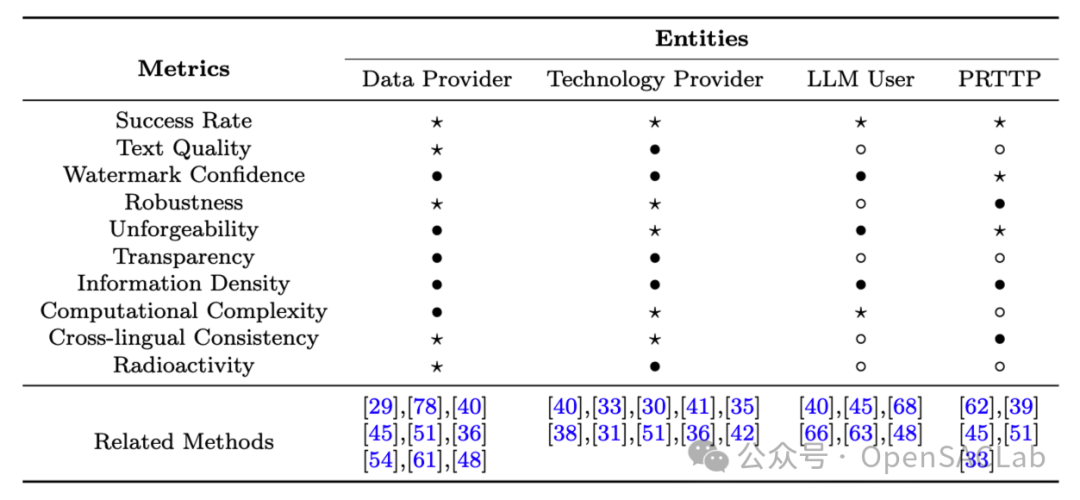 图 5 LLM实体与水印算法要求之间的关系,以及对相应水印算法的建议。星号代表基本要求,实心圆代表主要要求,空心圆代表次要要求。