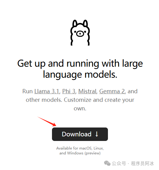 今天我们就来体验一下这个号称世界上最大、功能最强大的大模型,由于参数更大的模型,本机跑不了,所以我们选择8B。我们需要借助Ollama,Ollama 提供了运行和自定义多种大型语言模型的能力,支持 macOS、Linux 和 Windows(预览版)操作系统。我们在官网(Ollama)去下载软件。