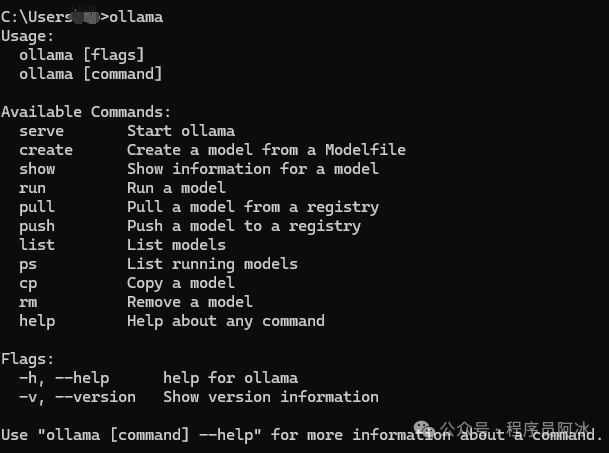 验证一下安装的情况,打开CMD命令窗口(win+r),输入ollama,回车。得到如下图,表明Ollama就OK啦。