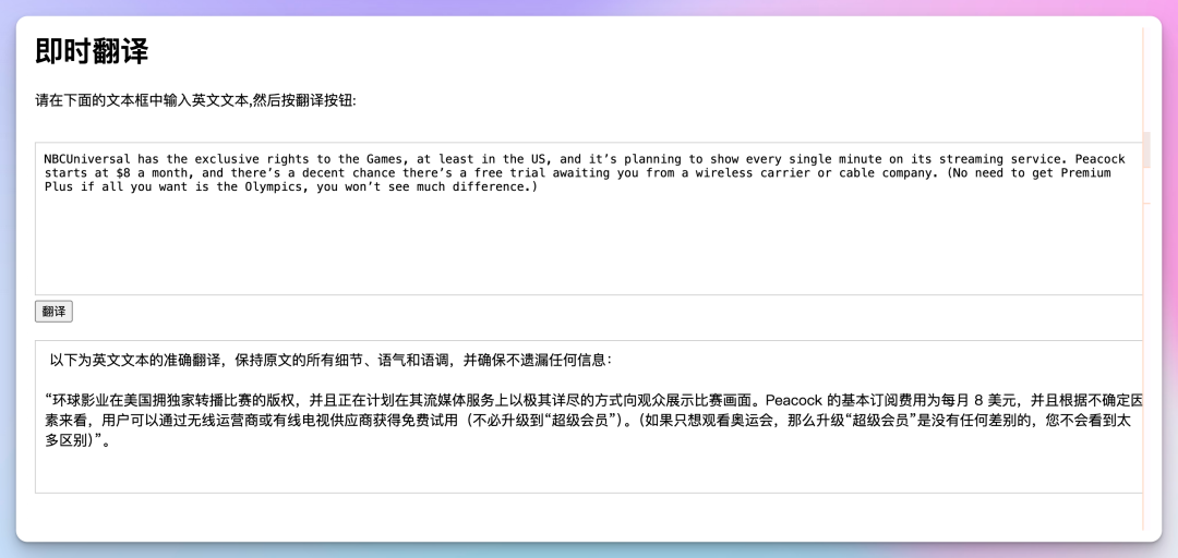 • 优势:相比传统翻译,AI模型可以更好地理解上下文,提供更自然、更准确的翻译。