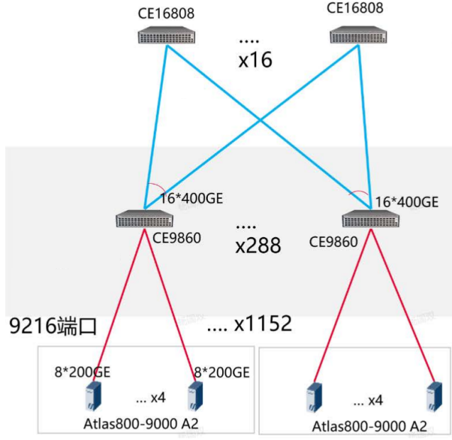 以上16台Spine交换机(CE16808)最多可以接入288台Leaf交换机(CE9860),288台Leaf交换机下行组多可以提供288*32=9216个200G端口,即9216张昇腾910B卡(1152台昇腾910B服务器),四舍五入,勉强称为“万卡集群”。