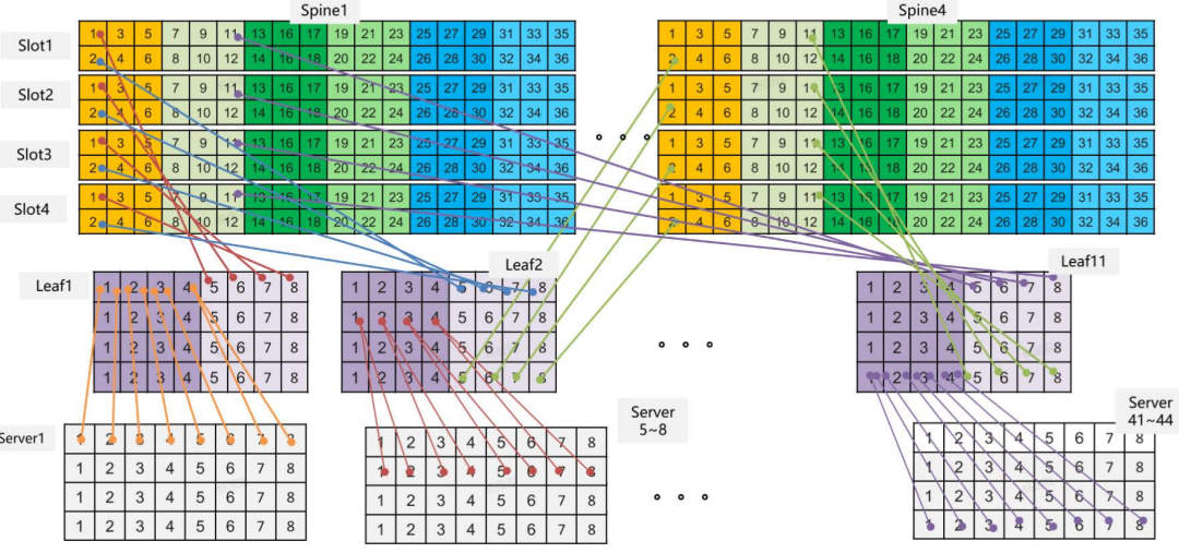 再附上一张“Spine交换机-Leaf交换机-AI服务器”端口连线图,有点复杂,感兴趣的可以仔细琢磨一下,不感兴趣的直接跳过,哈哈。