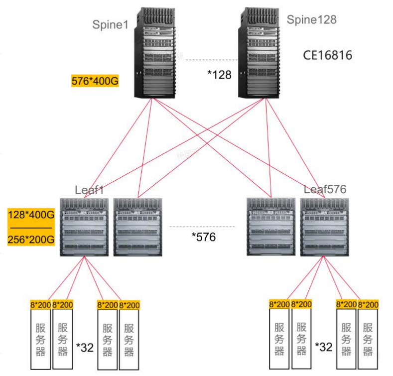 如果将Spine交换机从CE16808换成16块业务板的CE16816,则16台Spine交换机最多可以接入576台Leaf交换机(CE9860),可以接入的昇腾910B卡也翻倍到18432张(2304台昇腾910B服务器),名副其实的“万卡集群”。 再进一步,如果Leaf交换机采用CE16808,最多可以提供288个400G端口,其中128个400G上行端口,128个下行400G端口(一分二变为256个下行200G端口)。与之对应,128台Spine交换机(CE16816),每台CE16816可以提供576个400G端口。如下图所示:  128台Spine交换机对应576台Leaf交换机,每台Leaf交换机对应256个下行200G端口,一共576*256=147456张昇腾910B卡,妥妥的“十万卡集群”。