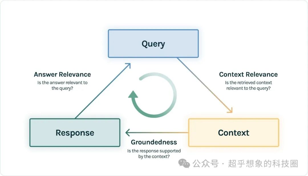 通常的认知是,自动化评估精度并不高,在吴恩达的DeepLearning.AI网站中的Building and Evaluating Advanced RAG课程提到,目前自动化测评,总体与人工测评的一致性,只有80%多,这个指标供大家参考,但实际情况下一般不会这么低,一方面是这个课程是23年大语言模型总体上还没现在这么强的时候出的,另一方面是,课程中介绍的方法(也是本文要介绍的方法)没有参考答案,而实际工作中一般是会准备参考答案的,在有参考答案的情况下,自动化评估与人工评估的一致性,还是容易达到比较高的水平的 本文所要介绍的方法,借助TruLens库,评估三个指标,TruLens称之为RAG三元组(RAG triad),由三个评估指标组成:上下文相关性(Context Relevance)、依据性(Groundedness)和答案相关性(Answer Relevance)。如下图所示。这三个评估指标,可以看做是RAGAS的子集,我们后面会有文章介绍如何使用RAGAS进行评估。  (https://www.trulens.org/trulens_eval/getting_started/core_concepts/rag_triad/)