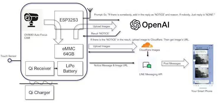 TIME LEAP CAM 相机通过在预设的时间间隔或特定时间拍摄图像来工作。这些图像存储在内置的64GB eMMC 存储中。在每次拍摄过程中,相机都会执行自动对焦以确保图像清晰。捕获的图像保存在 12 个可用轨道之一中,可根据需要进行配置。 在监控模式下,捕获的图像会连同提示一起发送到 OpenAI 的 GPT-4o 或 GPT-4-Turbo(例如,“如果有人,请在回复添加“NOTICE”和原因。如果没有人,只需回复“NONE”。AI根据提示分析图像内容,如果回复包含“NOTICE”,则表示图像符合指定条件。如果回复是"NONE",则表示不符合。 当检测到“NOTICE”时,图像将上传到 CloudFlare Images 以生成图像的 URL。然后,该URL与通知消息一起发送到LINE Messaging API。指定的LINE帐号会收到通知和图片。 通知条件可以使用自然语言设置,并且只要GPT-4o支持,系统支持多种语言。 相机由 3.7V LiPo 1100mAh 电池供电,使用 Qi 无线充电器充电。只需将相机放在 Qi 充电器上即可启动充电过程,电池充满后充电会自动停止。