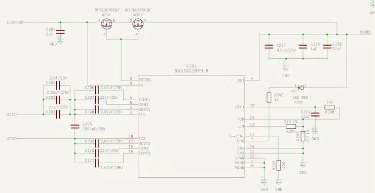 背面的触摸按钮 如果设置的图像拍摄间隔超过90秒,则相机在拍摄图像后将处于深度睡眠状态。如果持续时间少于 60 秒,相机将不会进入睡眠模式。这是因为 ESP32 深度睡眠功能在唤醒时会运行初始化序列,大约需要 30 秒才能完成。 相机在连接到WiFi时使用NTP进行时间同步,并使用RTC来维持时间。 设计原理图 这是 Qi 接收器原理图。我使用了BQ51013BRHLR作为控制集成电路。AC1 和 AC2 连接到了接收器线圈 WR483265-15F5-G。如果将 USB 连接到主机 PC,则此相机可以通过 USB 电源为电池充电。