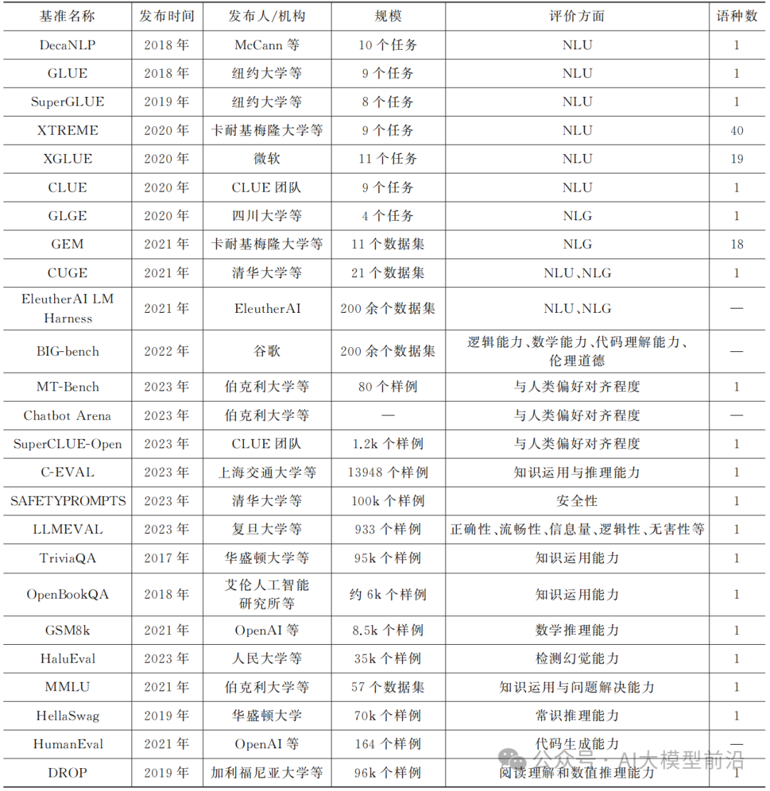 随着大语言模型的发展,单一的评测基准已无法满足需求。新的评测基准如CUGE,涵盖了7种语言功能、18个主流NLP任务,全面评估汉语理解和生成能力。
