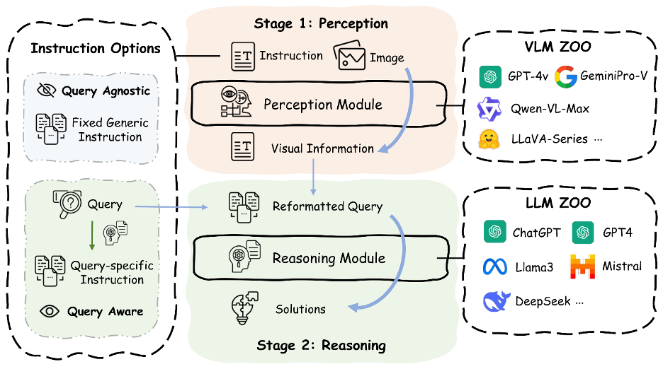 VLM在框架中只用于视觉感知,而推理任务则由LLM解决。通过固定框架中的LLM,可以测试不同VLM的感知能力;相对应地,通过固定VLM并使用不同LLM,可以观察VLM的性能是否被推理能力限制。