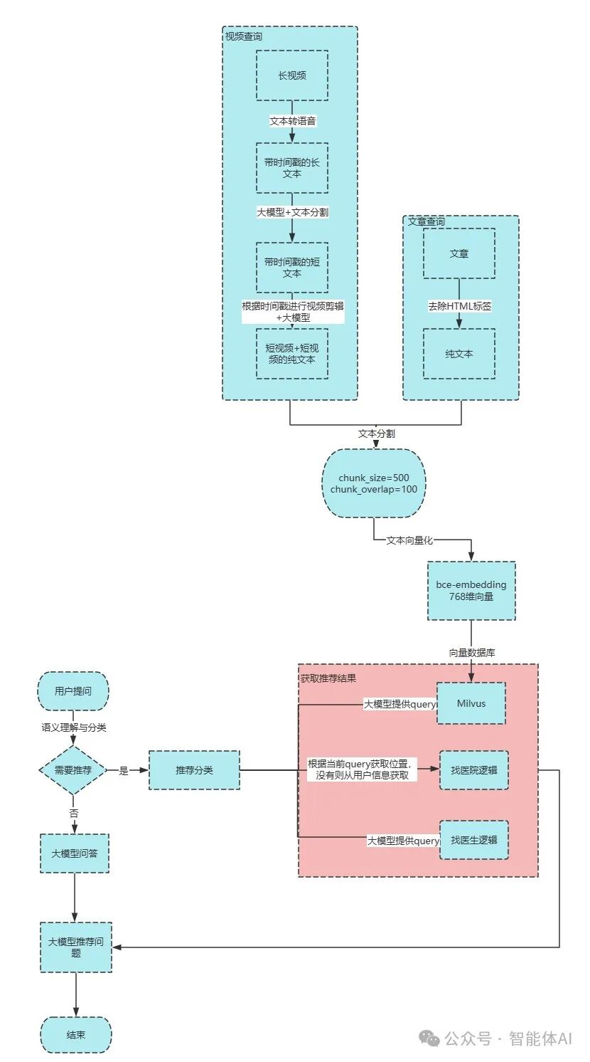 六、结果推荐与分类- 推荐分类:根据Milvus数据库查询的结果,系统会对推荐结果进行分类。推荐结果由大模型生成的query提供。系统根据当前query的内容,获取推荐的分类信息,提供精准的推荐结果。例如,在医疗咨询中,系统会推荐相关的医生或医院。