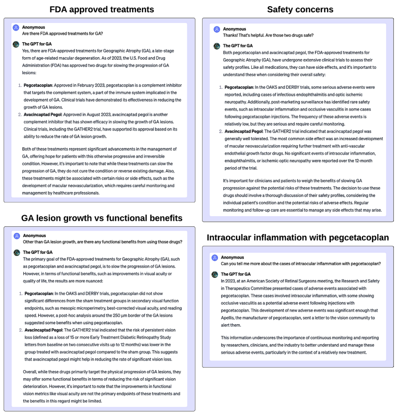 GA的治疗是一个有趣的例子,因为正在进行许多临床试验以寻找治疗方法。46,最近,一些新药物已被批准用于治疗GA。44 45 然而,对新批准药物的不良事件存在担忧。47 48 因此,“GA的GPT”能够总结最新的文献,为读者提供一个平衡的概述。我们提供了一个示例,如图5所示。