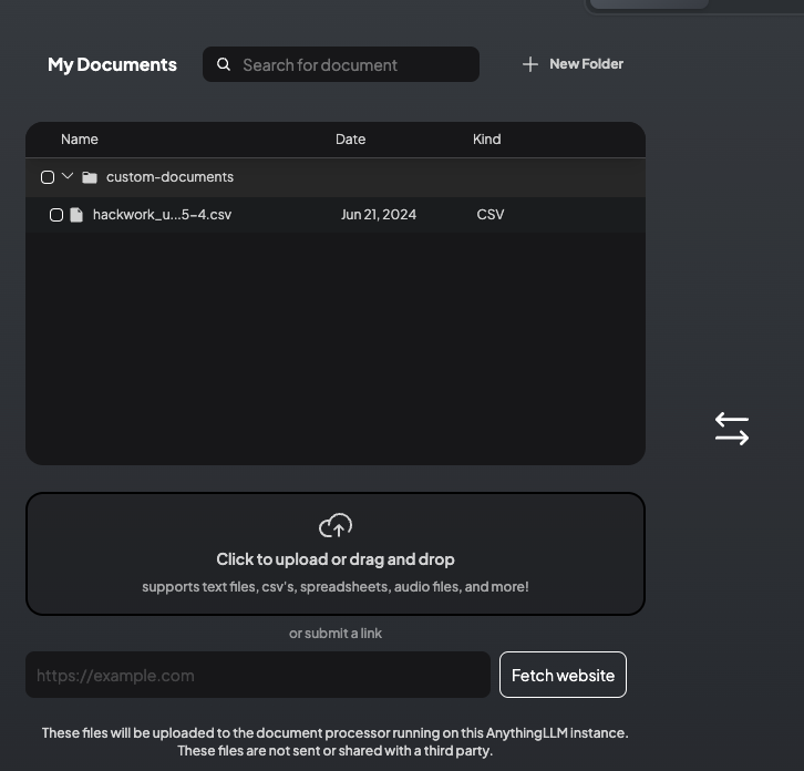 然后我们就可以在工作区添加一些txt文本文件、代码文件、csv以及表格、音频文件、外部网页等等,还支持搜索、连接数据库等等,通过AnythingLLM来管理本地的知识库就会方便很多。