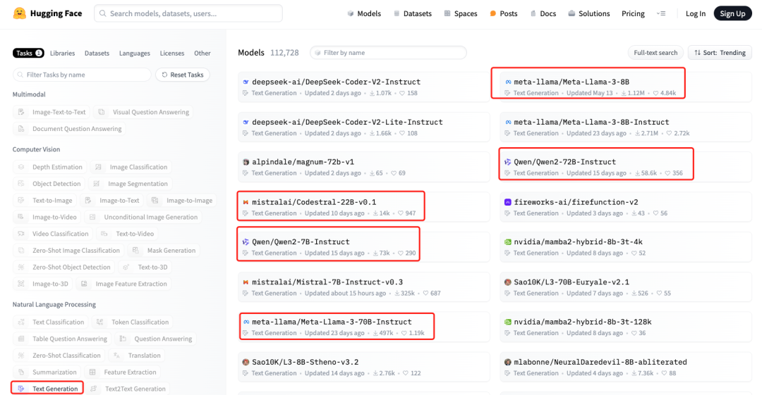 通过HuggingFace的分类Libraries下的Transformers就能获取到大模型的Trending流行趋势信息,其中Meta的羊驼Llama3系列、法国Mistral AI的Mistral系列、阿里的Qwen系列是目前业内最广泛使用的开源大模型。