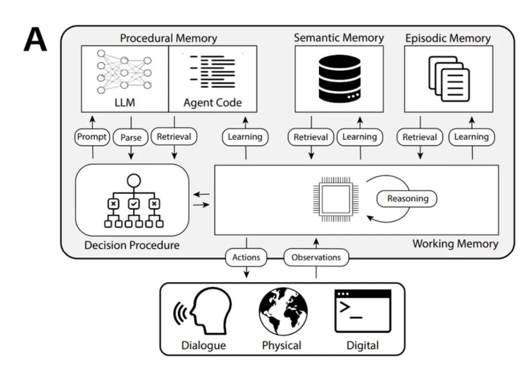 大语言模型在过去几年中迅猛发展,已成为推动人工智能领域前进的核心力量。基于大型语言模型(LLM)的AI智能体,正逐渐成为实现大模型应用落地的关键途径。AI Agent的认知架构正成为研究的热点领域。在我看来,AI Agent认知架构不仅能够提高Agent的性能和效率,还能够增强其可扩展性和适应性,使其能够更好地应对不断变化的需求和环境。为了深入探究这一问题,我们从人类的认知系统中汲取灵感,根据对行业前沿文章的研究,结合近期的实践,谈一谈关于Agent认知架构和记忆的实现内容,与大家分享。从人类的认知系统看AI Agents今天的AI与人类相比较,在认知系统层面的差异具体体现在哪些方面? 人的大脑面对不同的任务会做出不同的反应。世界著名的认知心理学家、诺贝尔经济学奖得主Daniel Kahneman在《Thinking, Fast and Slow》中对人类的认知系统进行了两种定义分类:优点是响应迅速,但在复杂任务中表现可能不理想。 反应快但改变较慢,就像人类的习惯难以快速改变。 LLM的工作方式可以类比于人类认知系统中的系统1:过往的训练数据直接决定了模型擅长的领域,无论面对简单或者困难的问题,语言模型输出的速度不会有太大区别,这是LLM的本能。和人类相比较,我们发现AI目前缺少的正是系统2的能力。而构建系统2,就是要让AI具有自己组织系统1的网络来构建新工具、解决复杂问题的能力。这也就是AI Agent的概念,通过对环境的感知,完成不同的子任务,从而来实现更复杂的目标。系统2通过语言推理、记忆调用、自我思考和规划,将复杂问题拆解成由系统1组成的流程单元,分别执行不同的任务从而达到目的。并在多次实践和运用中沉淀为“经验”数据提供给系统1去训练,从而让系统1获得新的能力。 总的来说,系统 1 和系统 2 共同作用,影响着我们的思考、判断和决策过程。那么,如何让每个智能体都拥有系统2的能力,使其能够调用长期记忆、计划和反思来解决复杂问题,实现从系统1到系统2的扩展呢?我们认为现在有许多关于⼈类记忆的理论与体系都可以应⽤到Agent 上,从而让Agent 模仿⼈脑的思考,例如下文所提到的CoALA框架。Agent认知系统的架构在《Cognitive Architectures for Language Agents》论文中,作者结合生产系统提出了一个概念性的框架CoALA(具有认知架构的Agent),基于LLM设计出Agent系统的各种使用方法提升信息处理、推理、自主学习和决策能力。
