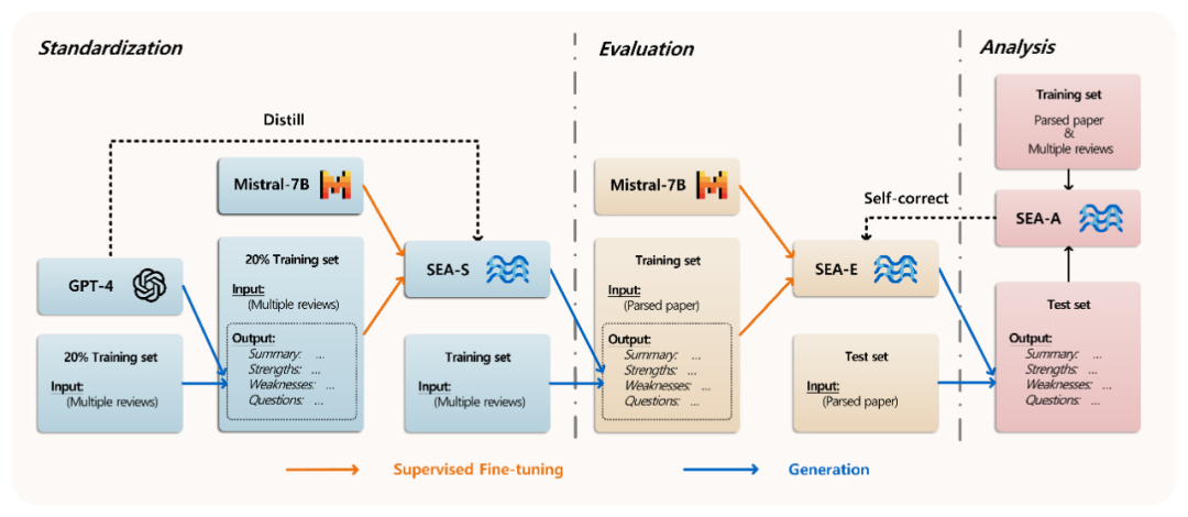 为了解决这些问题,本文提出将一篇文章的所有评审整合为一个评审。这种整合后的评审不仅内容丰富,还统一了格式。具体来说,本文尝试使用不同的闭源和开源模型基于特定指令进行整合,发现只有GPT-4能够达到理想效果。然而,GPT-4的成本高且缺乏扩展性。因此,作者随机抽取20%的评审数据,用GPT-4进行整合,并将整合后的评审作为标签,原始的多条评审作为输入,构建SFT数据集来微调开源模型Mistral-7B。通过这种方法,将GPT-4的整合能力蒸馏到Mistral-7B中,形成数据标准化模型SEA-S。最后,作者利用SEA-S对同行评审数据集的评审标签进行整合,生成高质量的评审标签。
