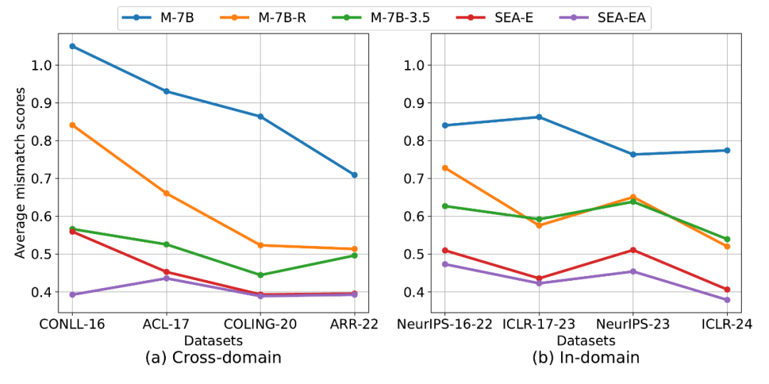 本小节分析了不同模型生成的评审内容与原始文章之间的一致性。将不同模型在测试集上生成的评审内容输入SEA-A,计算每个模型在不同数据集上的mismatch score。结果显示,SEA-EA在所有数据集上保持最低的mismatch score,其次是SEA-E,这证明了SEA能够生成与原始文章更一致的评审意见。Mistral-7B由于没有经过SFT,未能学习到生成评审与原始文章一致的内容,因此表现最差。